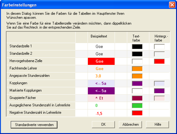 In diesem Dialog stellen Sie die Farben für die beiden Tabellen des Hauptfensters